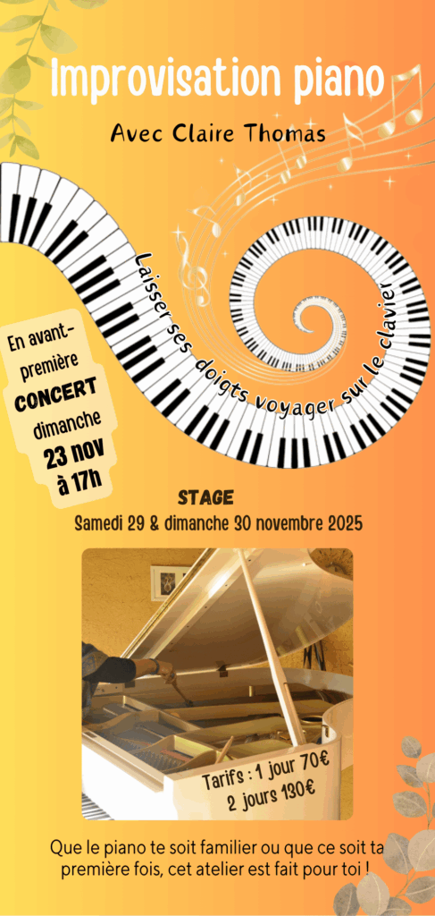 Je vous propose un voyage sonore, où s’entremêlent les notes, les pauses, les mélodies, les respirations, les percussions, les silences… Comme suspendu hors du temps, laisser de l’espace à la méditation, l’émotion…